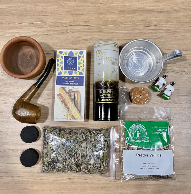 Esse kit tem elementos usados na firmeza ou altar dedicado a força de Preto Velho na Umbanda. São os itens necessários para você fazer um ciclo de 7 dias de rituais com a Linha de Preto Velho. Esse kit foi feito para os alunos da IMERSÃO Vela, Reza e Oferendas na Umbanda.